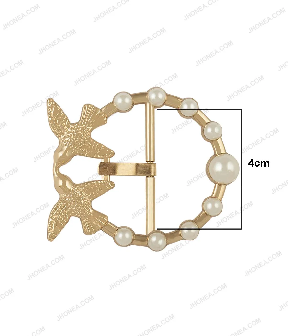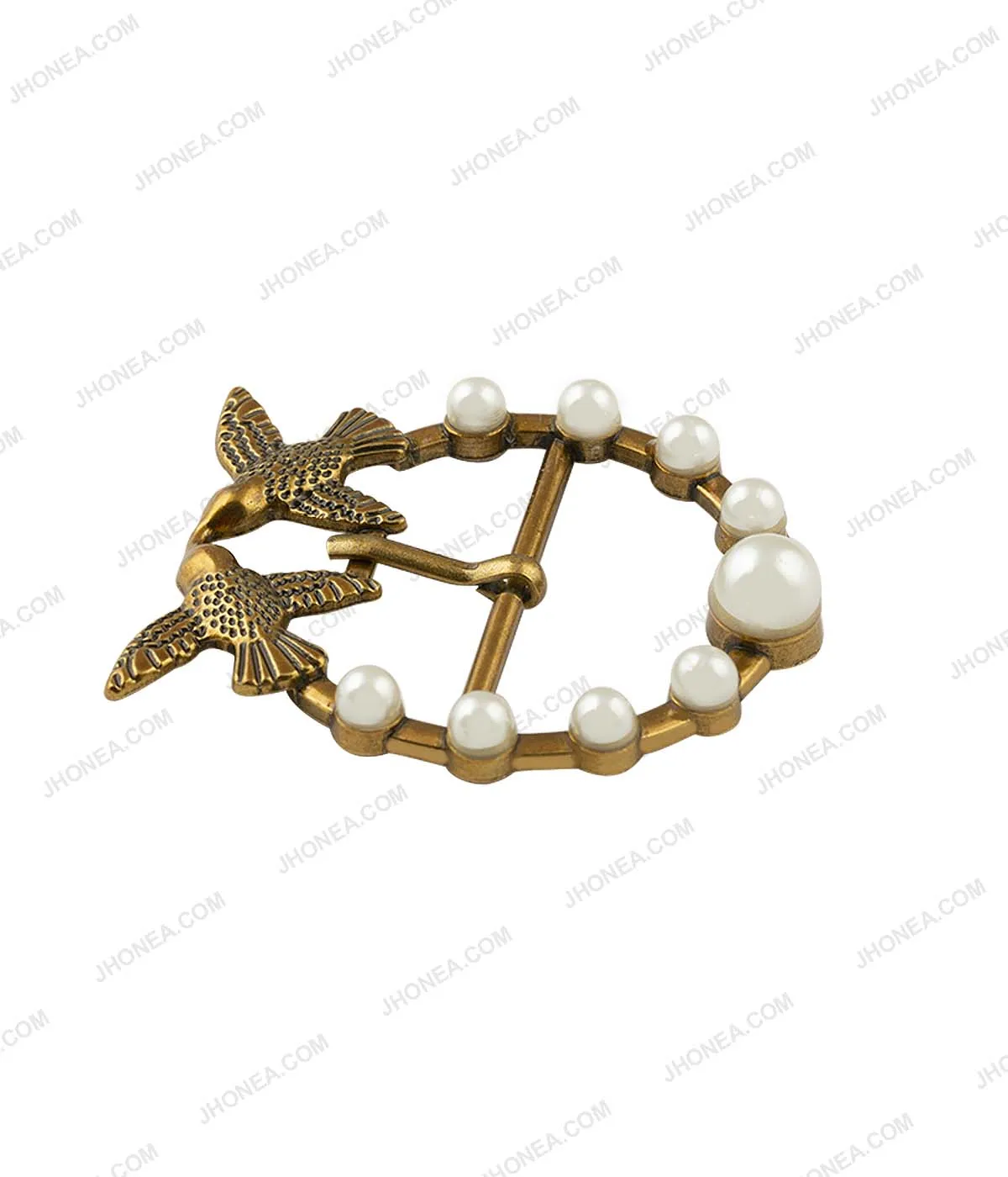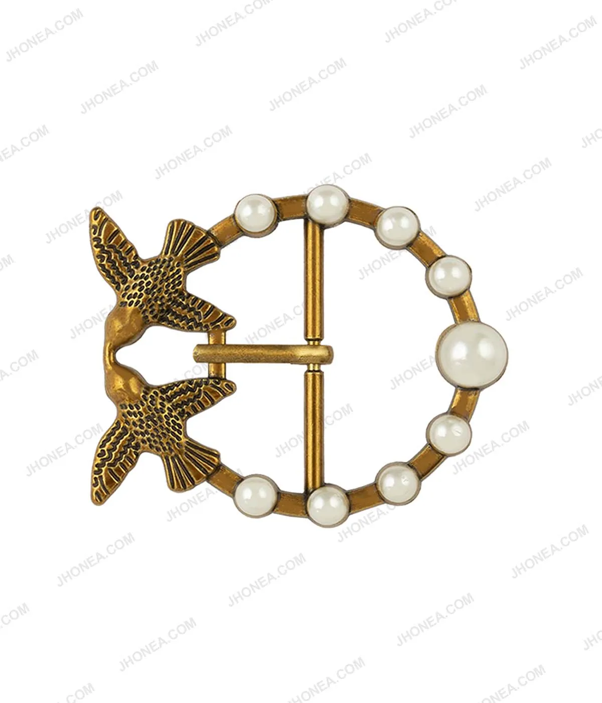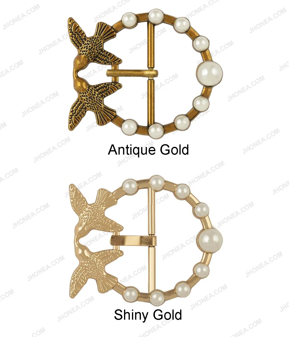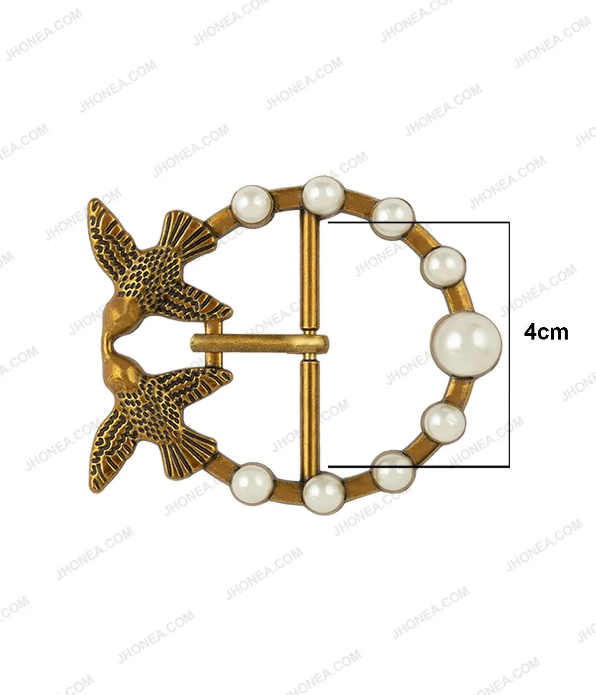 - A lovely vintage design romantic symbol swallow birds with accented pearls on the crescent frame which represents faithfulness. This premium quality symbolic crescent structure lightweight fashion center bar prong belt buckle accessory with shiny pearl accents on the buckle adds extra oomph to the overall appearance of the buckle. Available in 2 different colors- Shiny gold & Antique gold. The bar inside is 40mm wide so you can insert any type of cloth material belt/elastic of this size to create the belt.