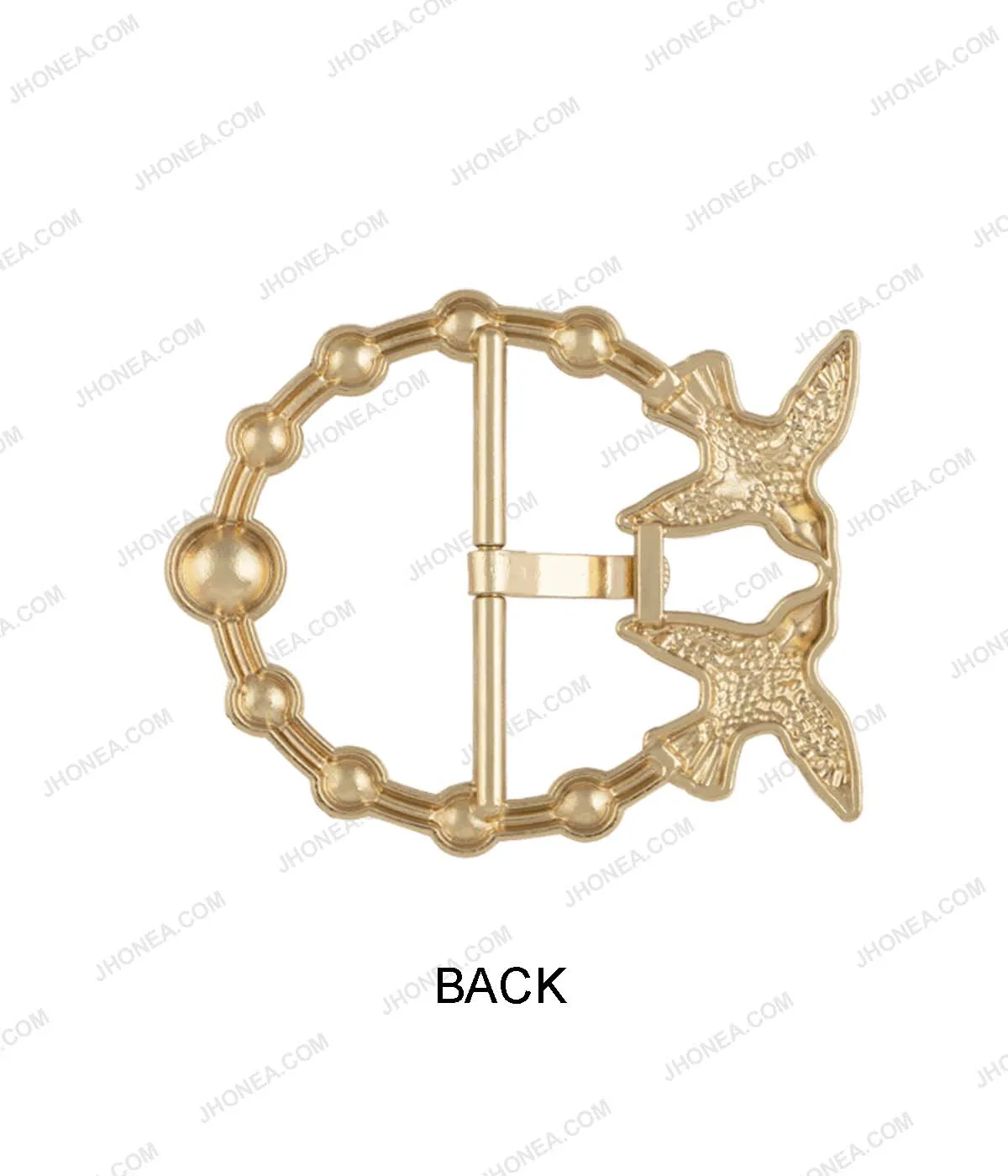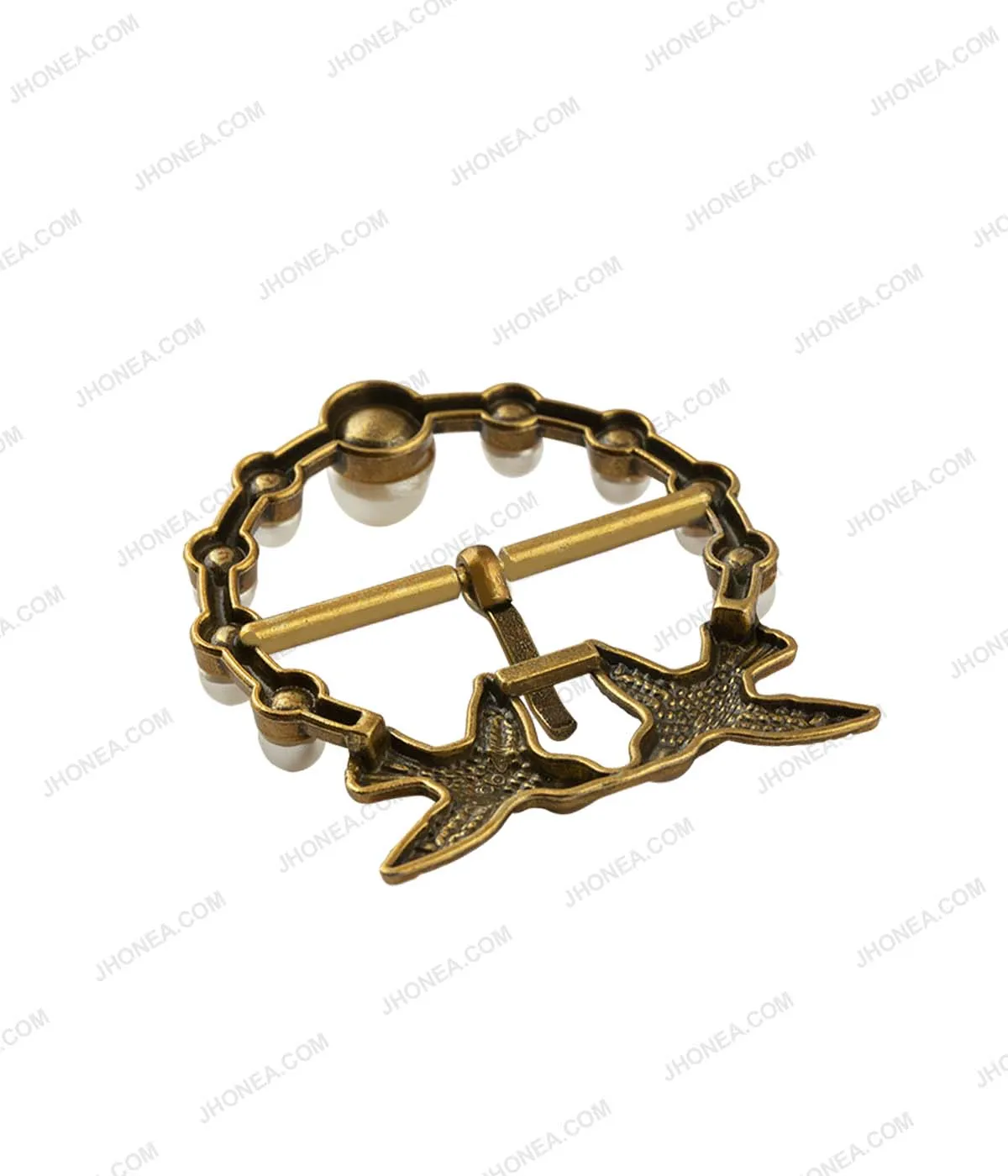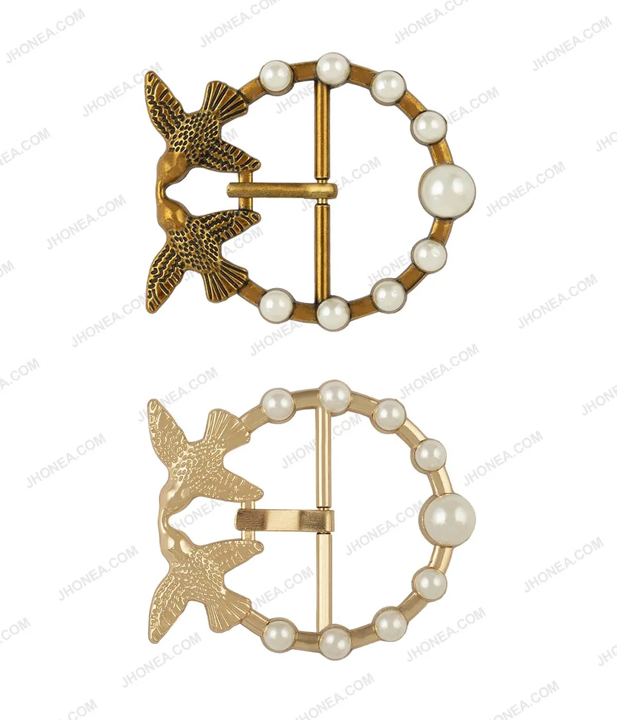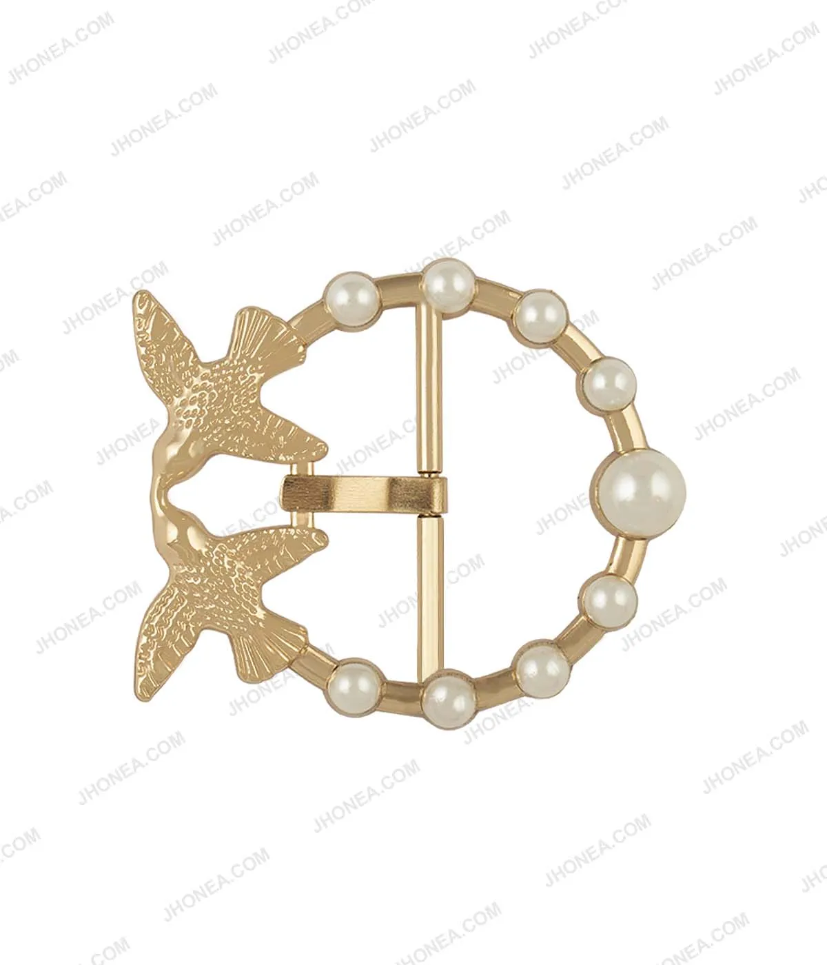 - A lovely vintage design romantic symbol swallow birds with accented pearls on the crescent frame which represents faithfulness. This premium quality symbolic crescent structure lightweight fashion center bar prong belt buckle accessory with shiny pearl accents on the buckle adds extra oomph to the overall appearance of the buckle. Available in 2 different colors- Shiny gold & Antique gold. The bar inside is 40mm wide so you can insert any type of cloth material belt/elastic of this size to create the belt.