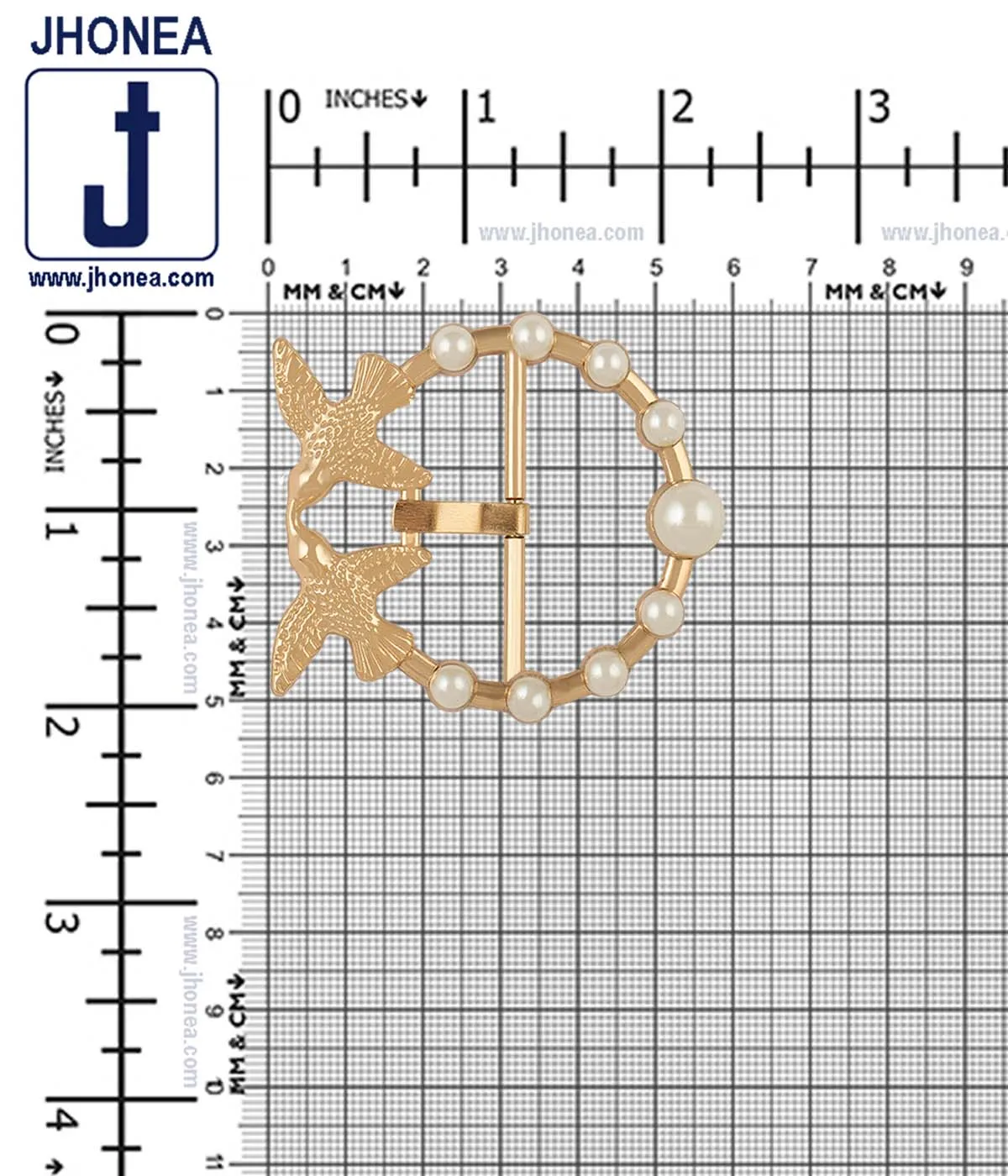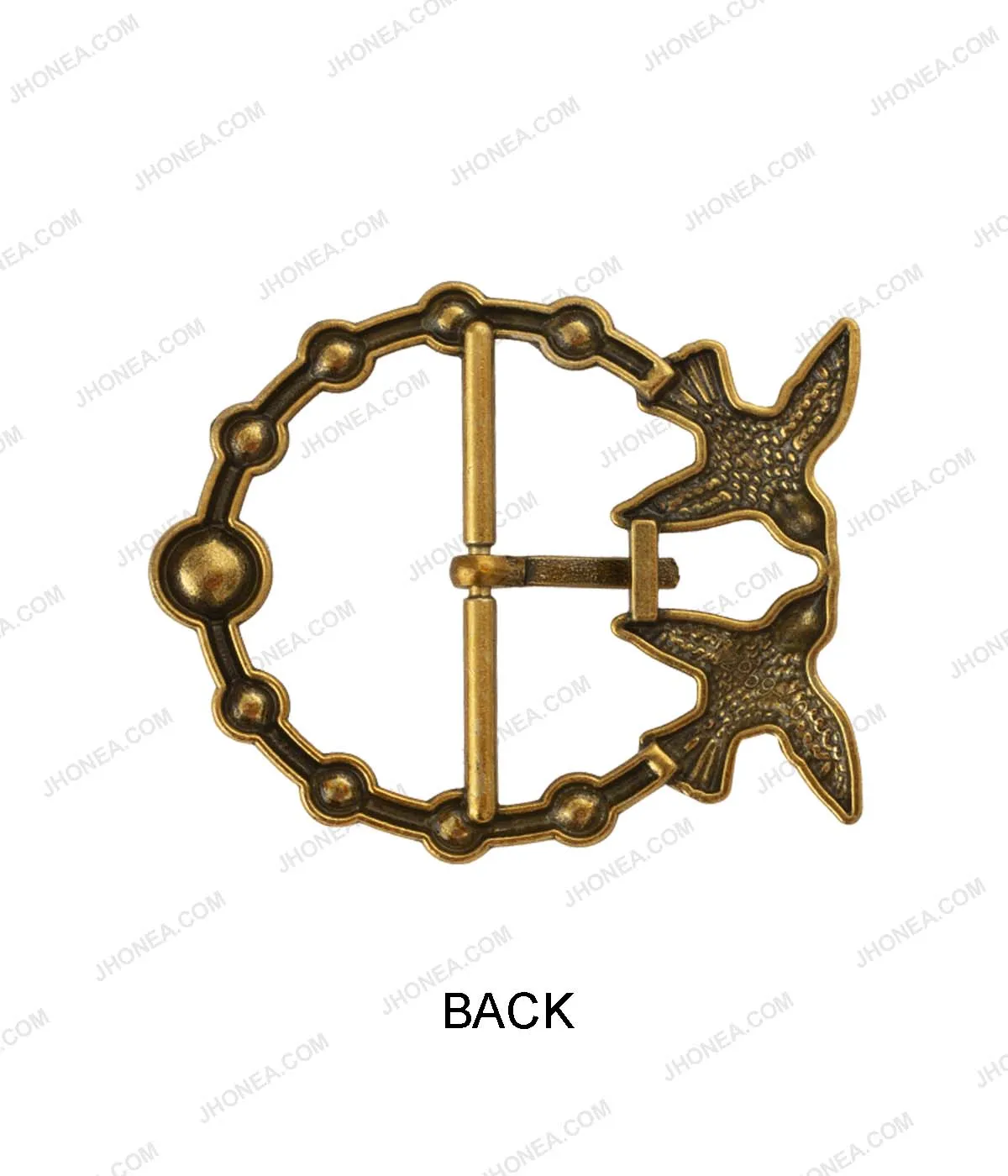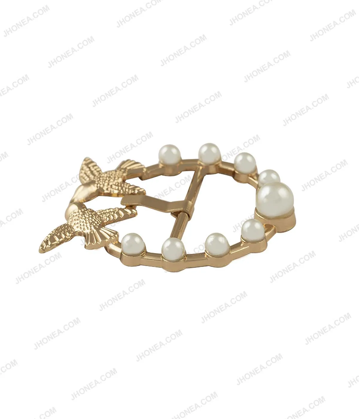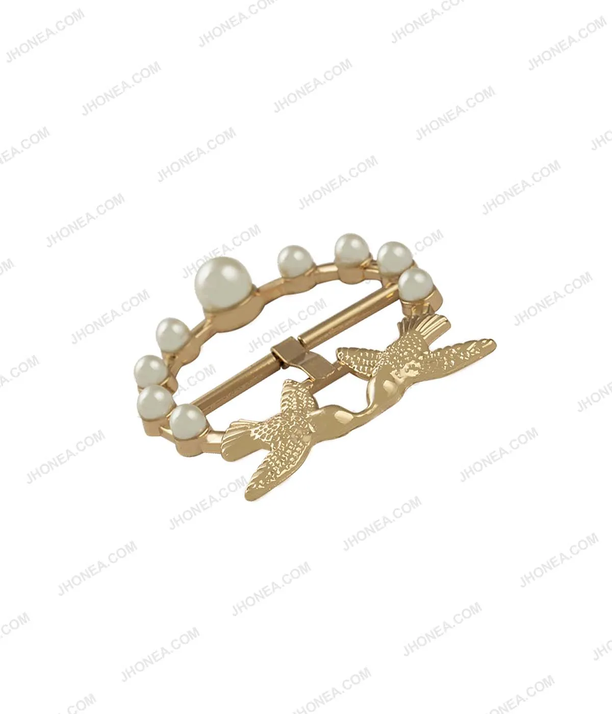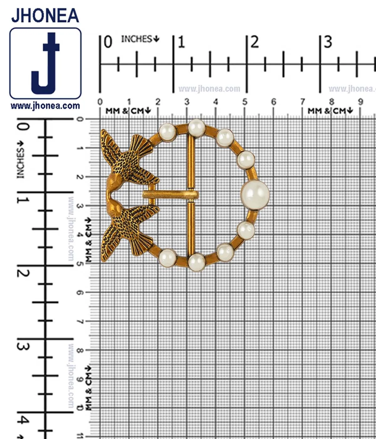 - A lovely vintage design romantic symbol swallow birds with accented pearls on the crescent frame which represents faithfulness. This premium quality symbolic crescent structure lightweight fashion center bar prong belt buckle accessory with shiny pearl accents on the buckle adds extra oomph to the overall appearance of the buckle. Available in 2 different colors- Shiny gold & Antique gold. The bar inside is 40mm wide so you can insert any type of cloth material belt/elastic of this size to create the belt.