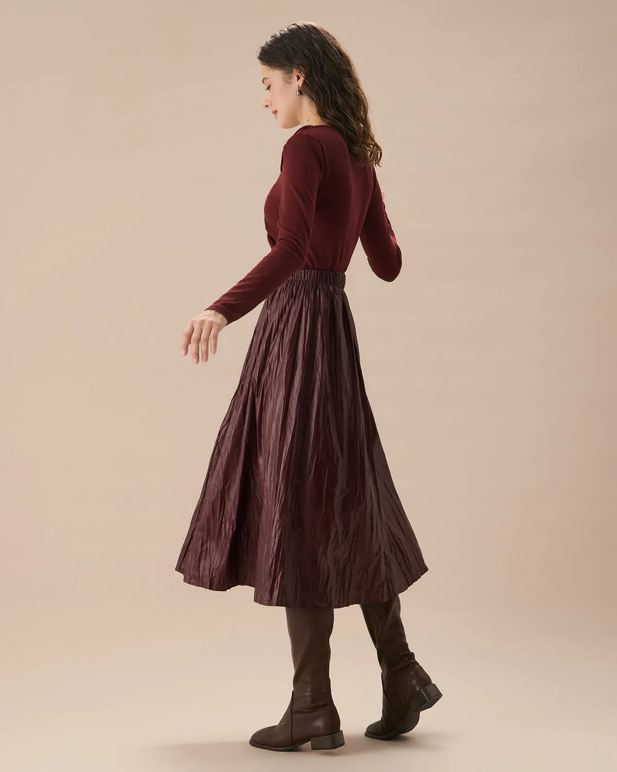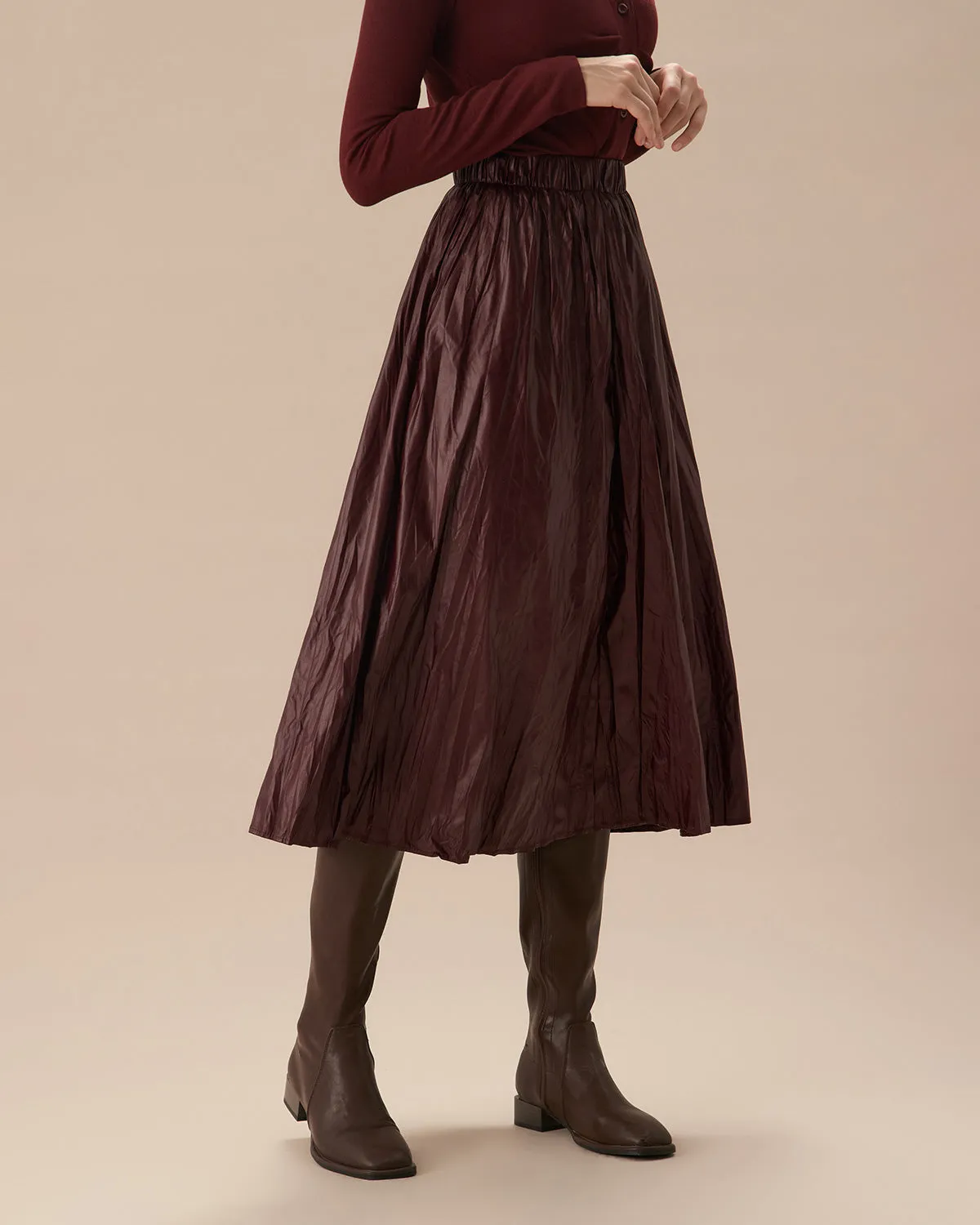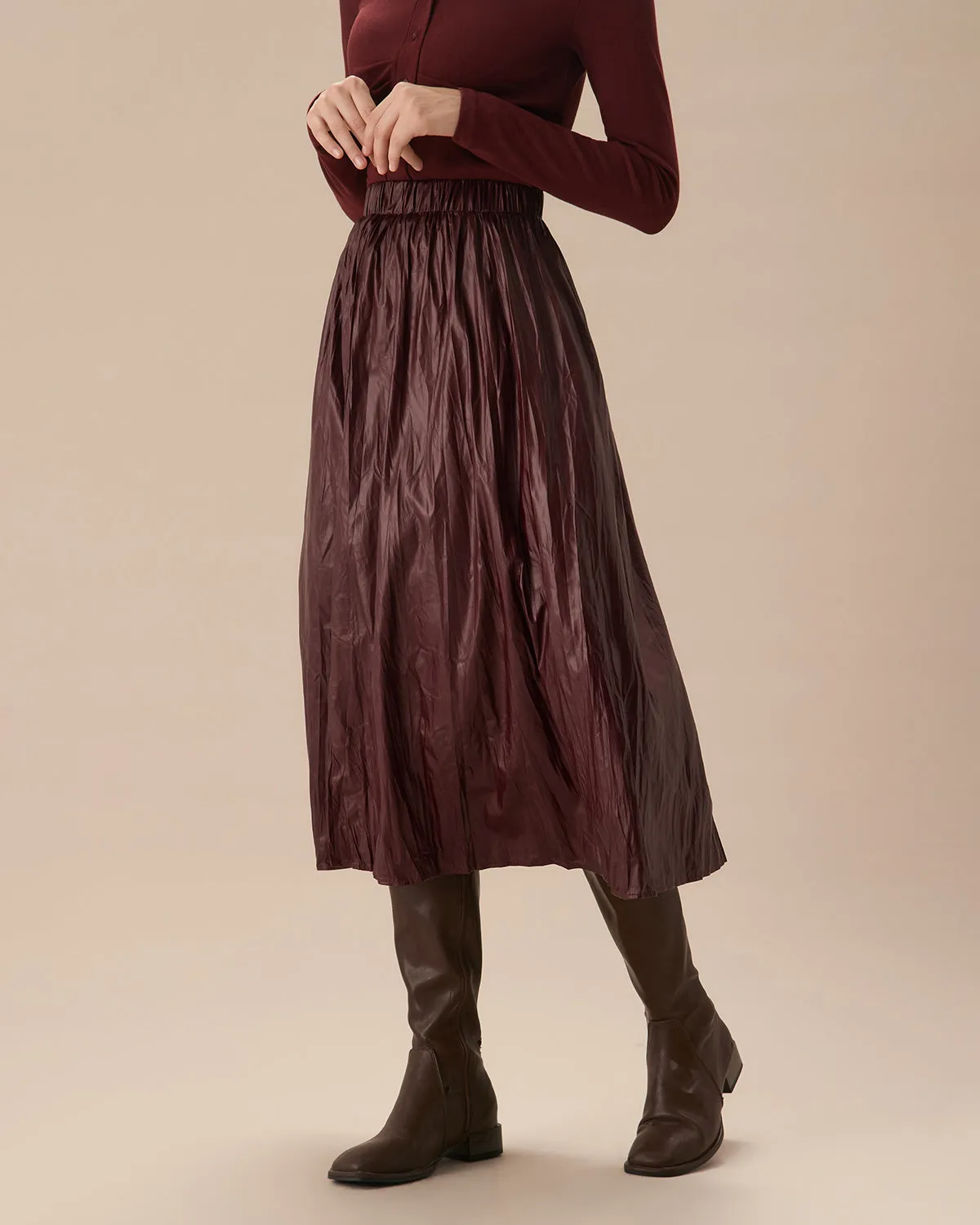 Featuring a stretchy elastic waistband and chic ruched detailing, this midi skirt creates a flattering, feminine silhouette. The rich wine red color adds a bold touch, making it perfect for both casual and dressed-up occasions.